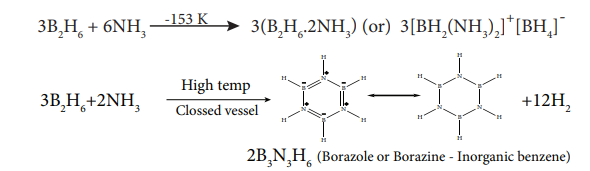 When diborane treated with excess ammonia at low temperatures diborane gives diboranediammonate. On heating at higher temperatures it gives borazole.